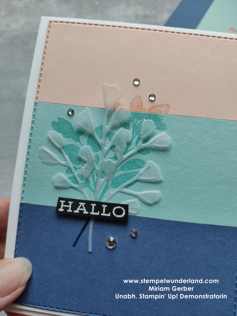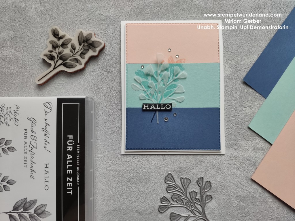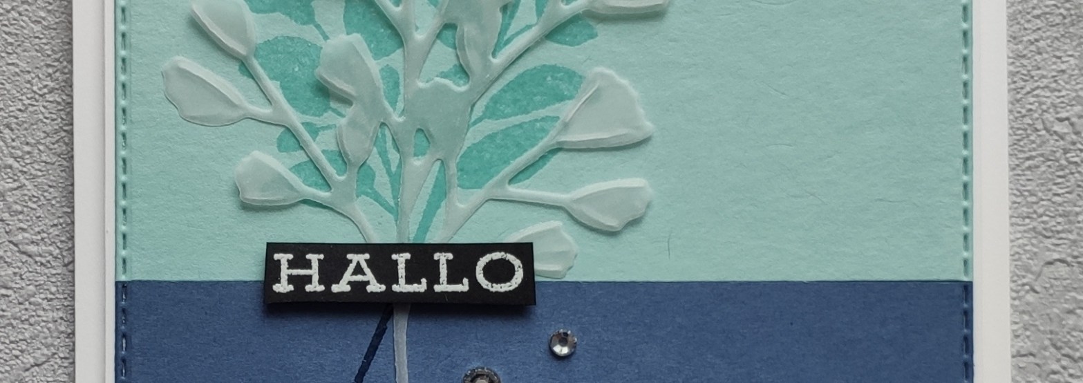 Ich habe etwas rumgespielt mit verschiedenen Varianten. Bei dieser hier habe ich im Hintergrund mit Klarlack embosst.