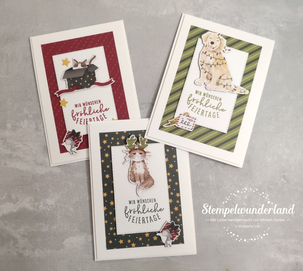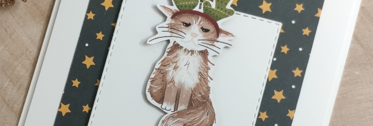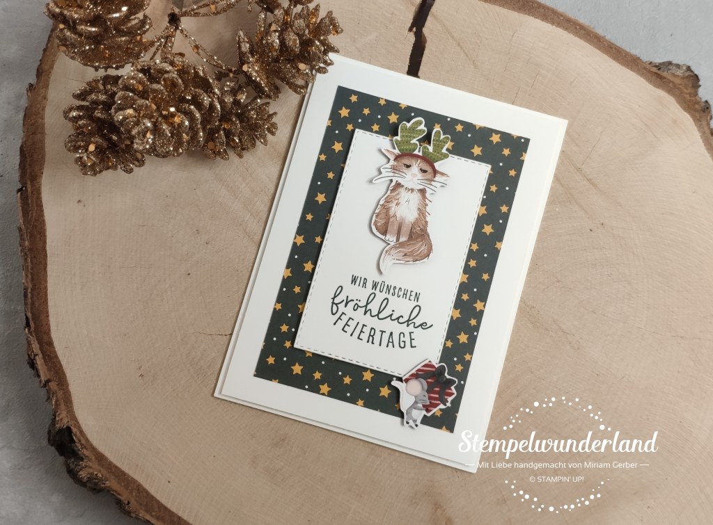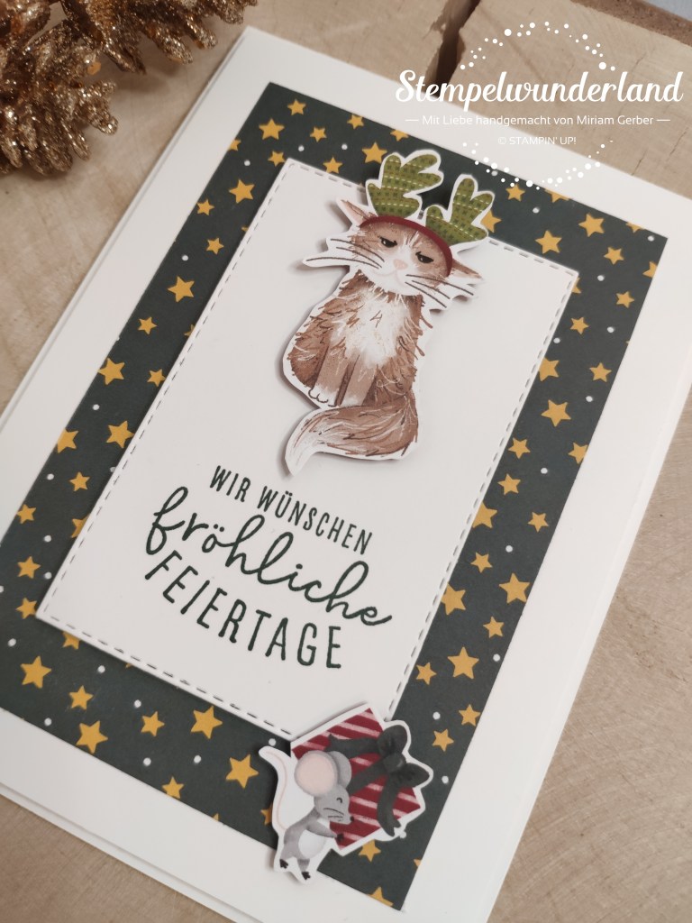 Dieses Mal hat ein geliebtes Haustier seinen Platz auf der Karte gefunden 🙂 Im Designerpapier Weihnachten im Strumpf sind so süße Tiere abgebildet, die sich wunderbar von Hand ausschneiden lassen.