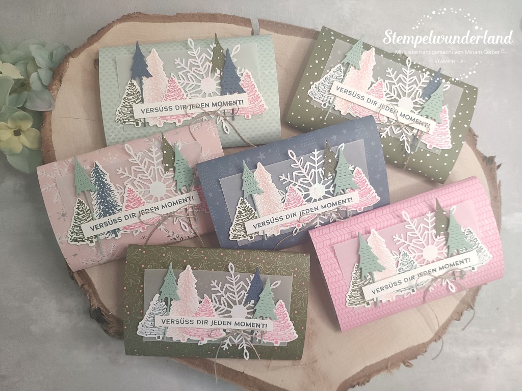 Und da ich ein paar davon gebraucht habe, habe ich aus dem wunderbaren Designerpapier Zauber der Feiertage auch andere Designs verbastelt.