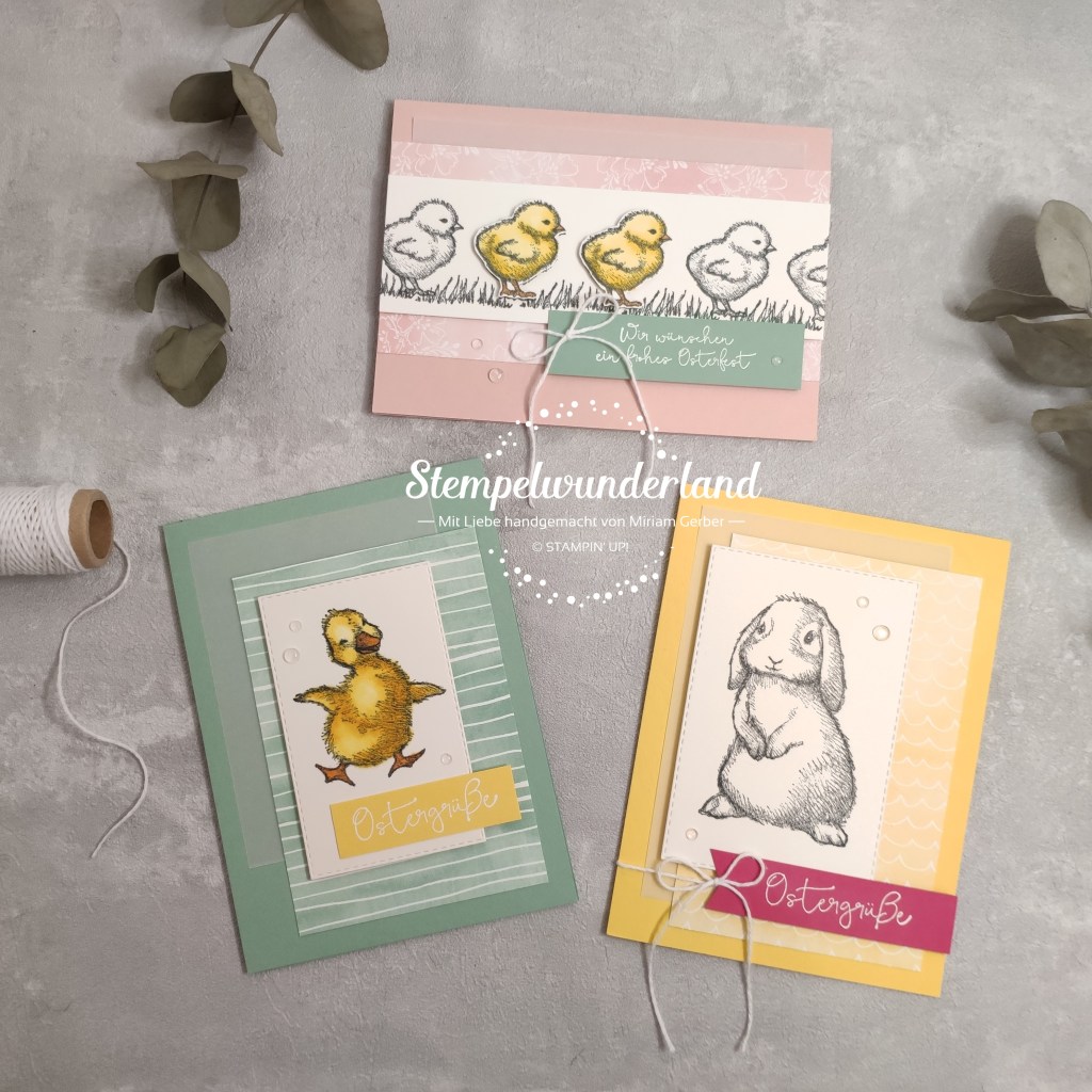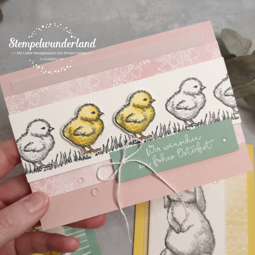 Bei den Küken habe ich beide Varianten kombiniert, die wieder mit Stampin‘ Blends gefärbten Küken ausgeschnitten und mit Abstand aufgeklebt.