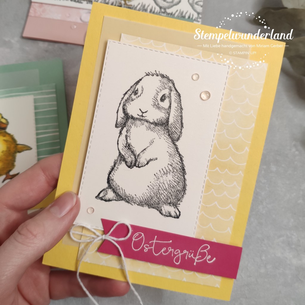 Ihr wisst ja, ich bin ein Kartenfan, weshalb es auch für diese Gelegenheit eine Karte sein sollte. Entstanden sind drei Stück mit dem zuckersüßen Stempelset Ostergrüße aus dem Minikatalog Januar bis Juni 2022.